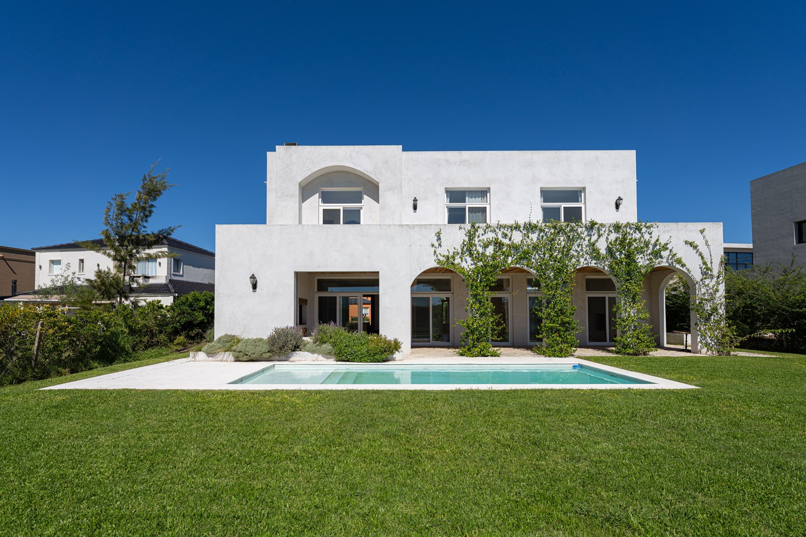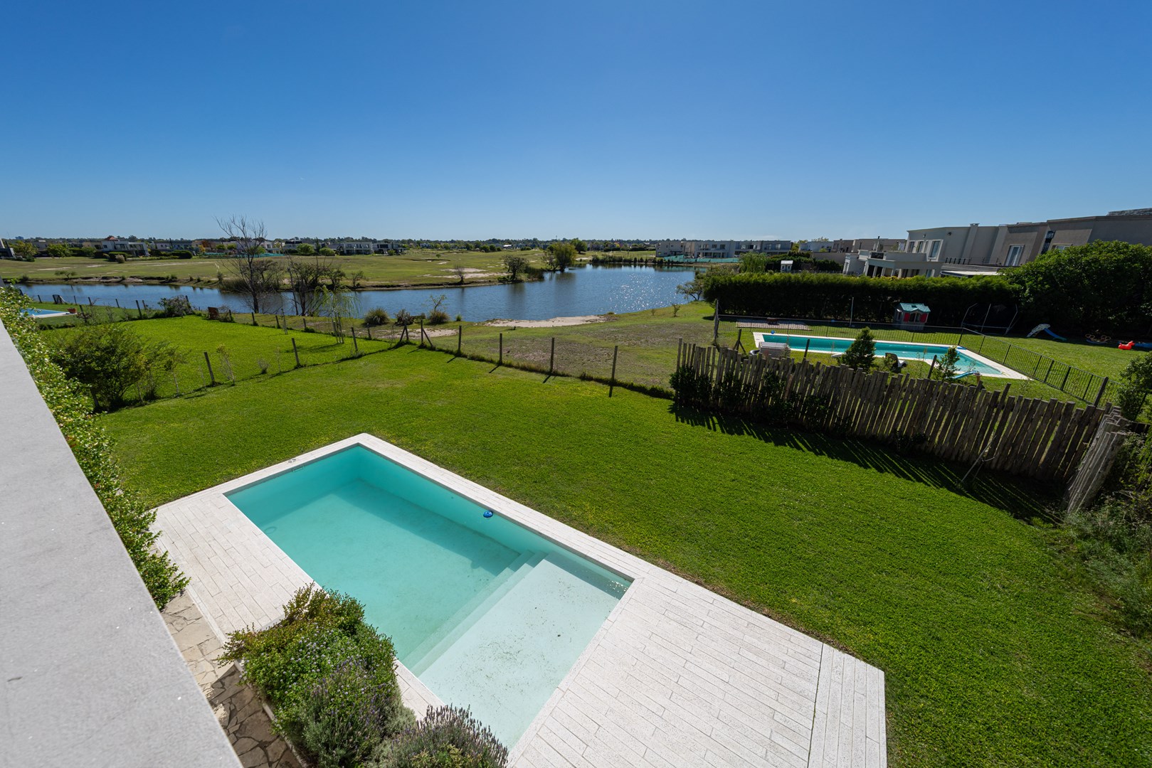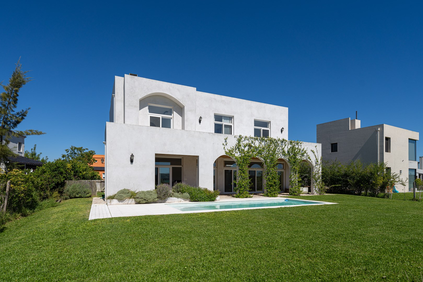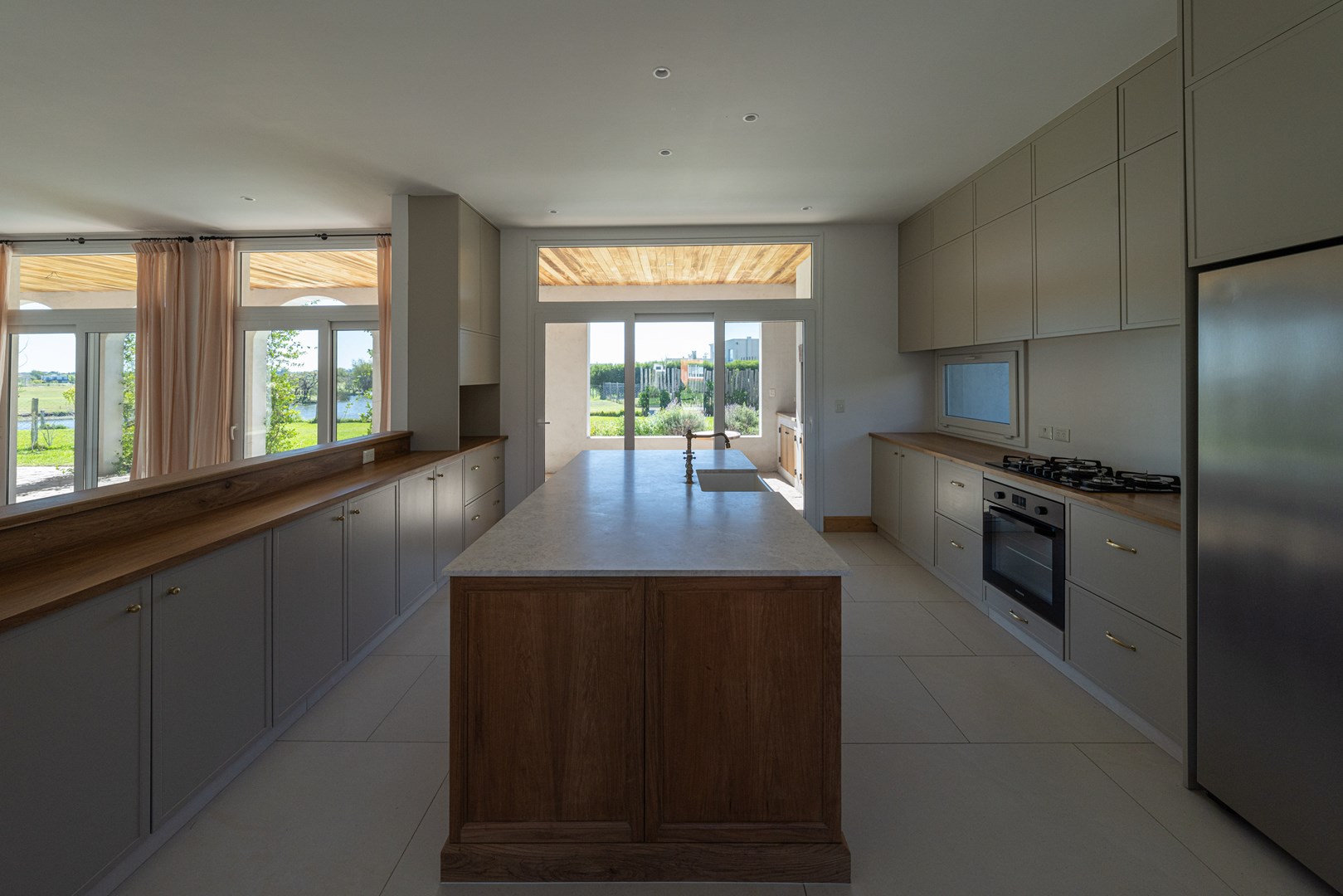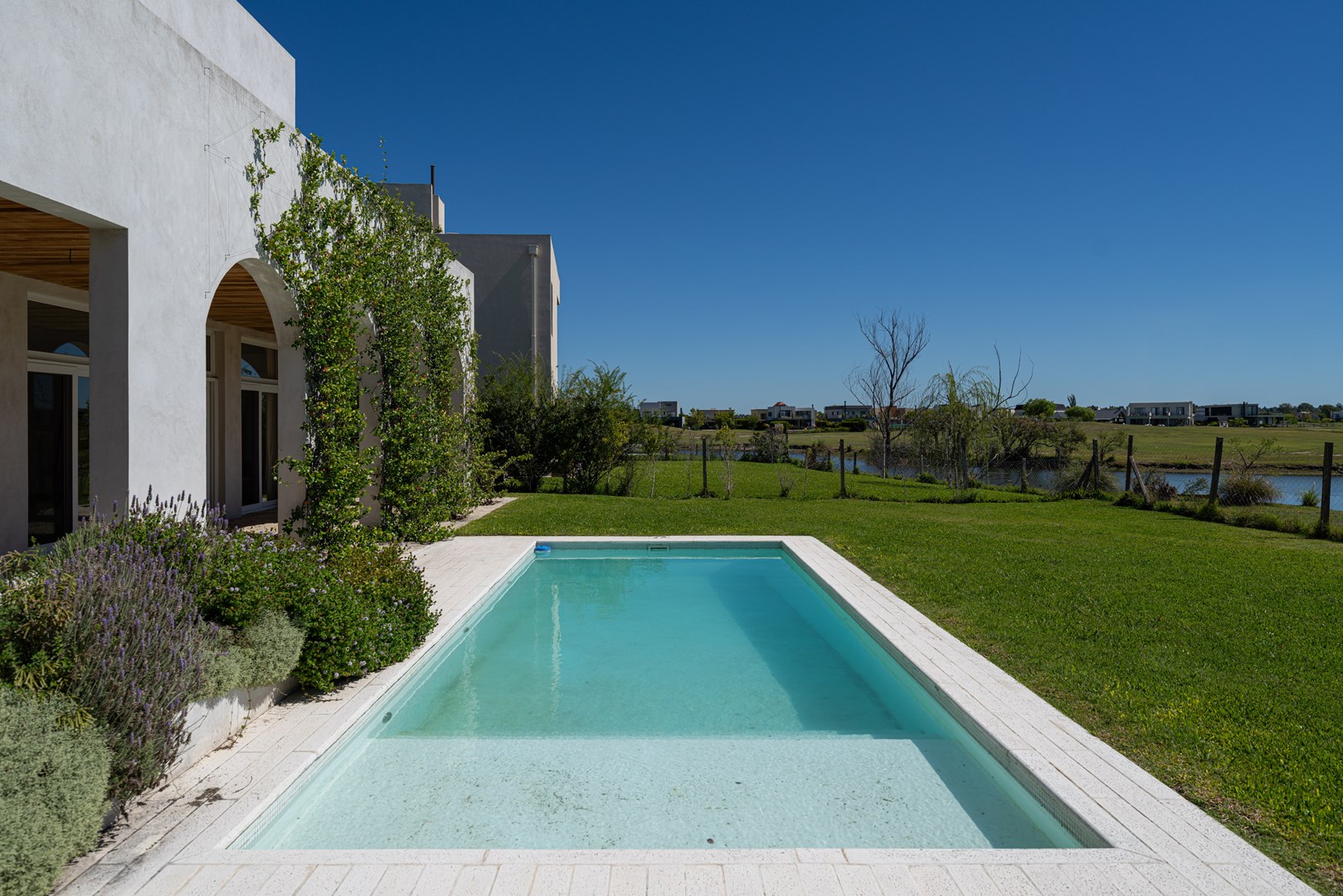 Casa a estrenar con salida a la laguna y orientación norte – Estilo mediterráneo | El Cantón Golf 3 dormitorios | estudio independiente | galería con parrilla | pileta con playa húmeda Ubicada en El Cantón – Barrio Golf, esta casa a estrenar combina arquitectura de estilo mediterráneo, materiales nobles y amplios ambientes llenos de luz, con vista abierta y posibilidad de acceso directo a la laguna. El ingreso se realiza a través de un patio interno que aporta privacidad, conduciendo al hall de entrada en doble altura, donde se destaca la escalera de madera con baranda de hierro, iluminada por grandes ventanales que aportan luz natural durante todo el día. Desde este espacio también se aprecia un segundo patio interno, que aporta aún más luz y conexión con el exterior. Planta baja En este nivel se ubican el playroom, el living comedor con cocina integrada y el toilette. El living con hogar interior se conecta con la galería y el jardín mediante amplios ventanales corredizos, generando una excelente integración entre interior y exterior. El toilette cuenta con mesada de mármol y mueble de madera petiribí, y debajo de la escalera se encuentra un práctico placard recibidor. La cocina continúa con la estética cálida de la casa y posee una gran isla central de madera petiribí con mesada de mármol y bacha, muebles laqueados y alacenas altas que brindan amplio espacio de guardado. Está equipada con lavavajillas panelable, horno, anafe a gas y heladera doble, además de una barra con coffee station que permite integrarla con el living. La entrada de servicio conecta directamente con la cocina y el lavadero, que dispone de amplio espacio de guardado y despensa. Desde la planta alta existe además una bajada interna para la ropa sucia. Exterior La casa se abre hacia una amplia galería con arcadas cubiertas de jazmín y vista hacia la laguna, generando un espacio ideal para disfrutar del exterior. Cuenta con parrilla equipada y se conecta con el sector de la pileta con playa húmeda y deck, además de un baño exterior de pileta. El jardín tiene orientación norte, posee riego por aspersión y posibilidad de acceso directo a la laguna. Planta alta En este nivel se desarrollan tres dormitorios y un estudio con acceso independiente. La suite principal cuenta con vestidor, baño completo y salida a una terraza privada con vista a la laguna. Los otros dos dormitorios también disfrutan de vista al agua y comparten un baño completo. Ambos baños cuentan con muebles de madera y mesadas de mármol. El estudio, con acceso tanto desde el interior de la casa como desde el exterior mediante una escalera independiente, resulta ideal para oficina, taller o espacio de trabajo independiente. Destacados de la propiedad Vista y salida a la laguna Jardín con orientación norte Dos patios internos que aportan luz y privacidad Galería con parrilla Pileta con playa húmeda y deck Estudio con acceso independiente Calefacción por losa radiante Aberturas con DVH Materiales de primera calidad Una propiedad ideal para quienes buscan diseño, amplitud y vida frente al agua dentro de El Cantón. Consultanos para coordinar una visita.